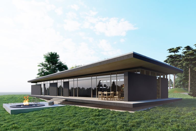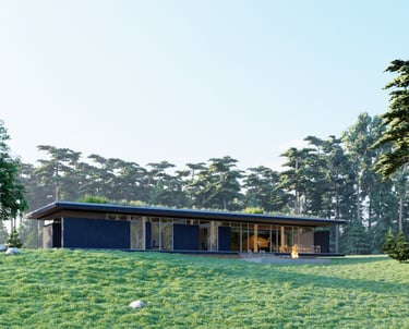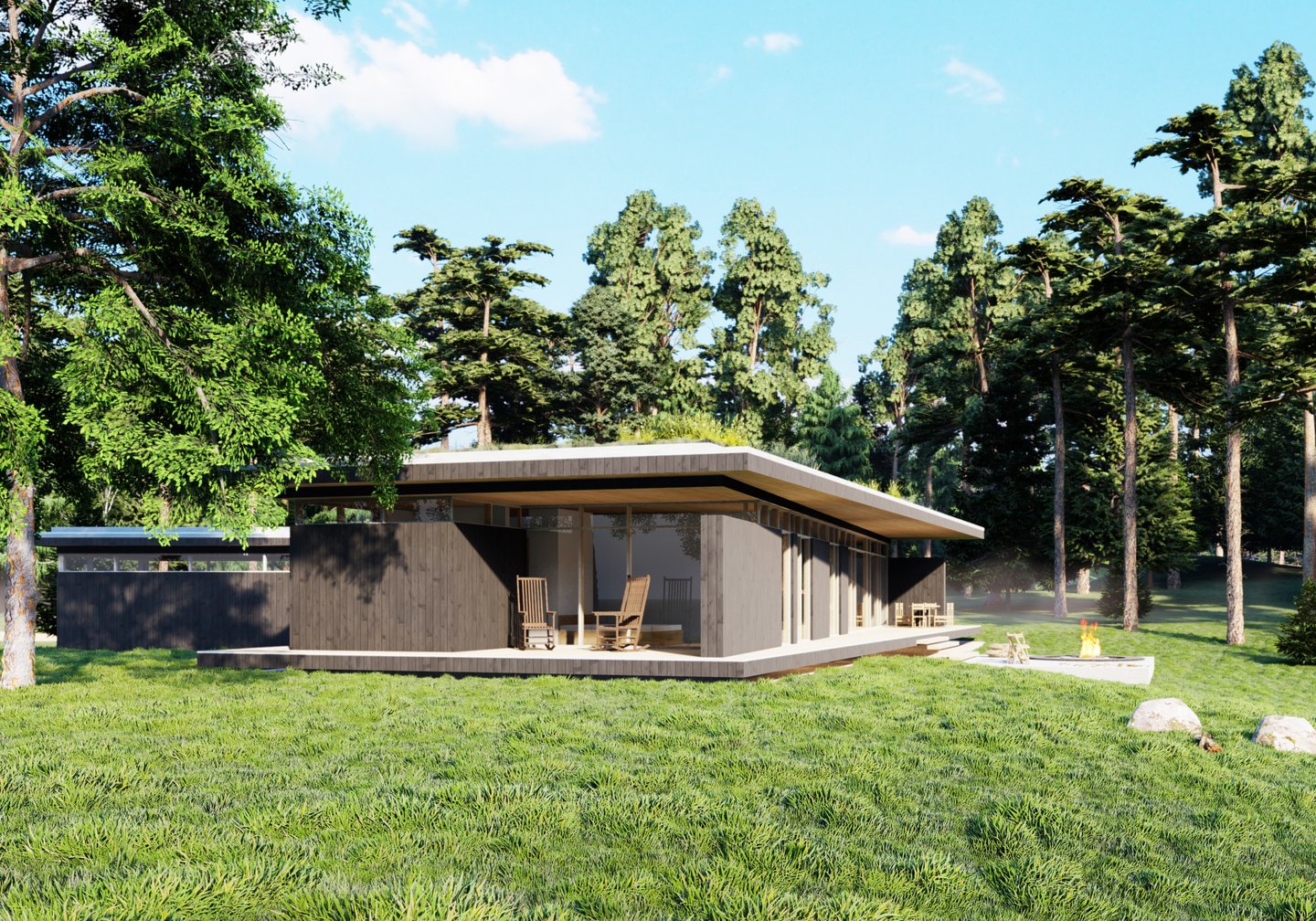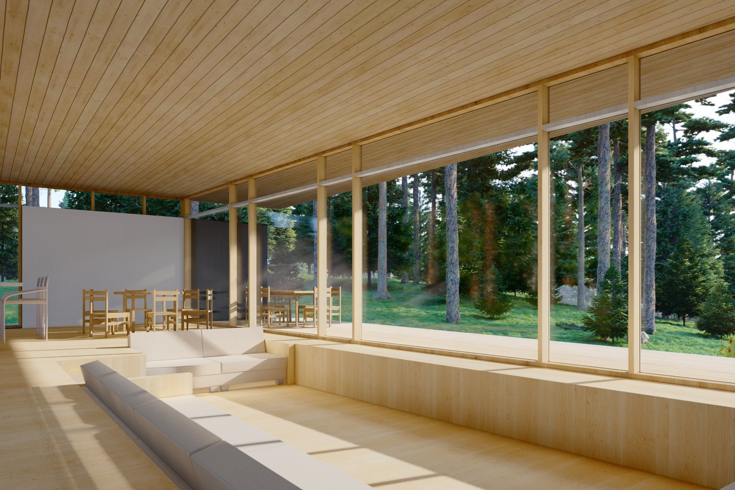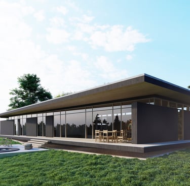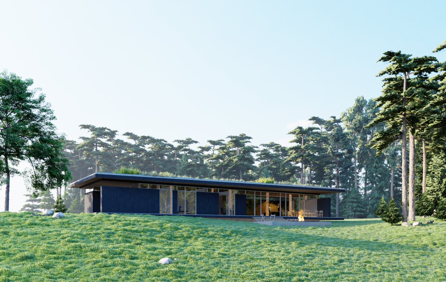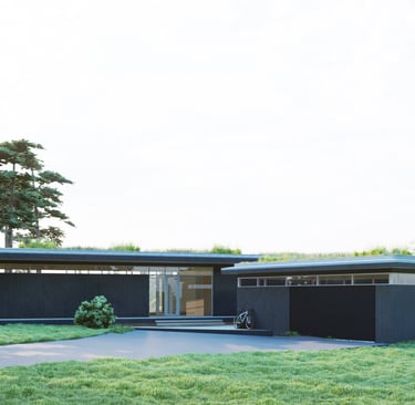 Tai modernus, minimalistinis dviejų tūrių namas. Monotoniškas tamsių plytų fasadas ir dvišlaičiai stogai be karnizų sukuria griežtą siluetą, kurį sušvelnina stiklo skaidrumas bei glaudus ryšys su supančia gamta. Horizontalios langų juostos suteikia pastatui dinamiškumo, o tamsi tekstūra išryškina augmenijos spalvas. Architektūrinis sprendimas levituoti masyvų viršutinį tūrį virš stiklinių vitrinų pabrėžia konstrukcinę drąsą ir vizualinį lengvumą.