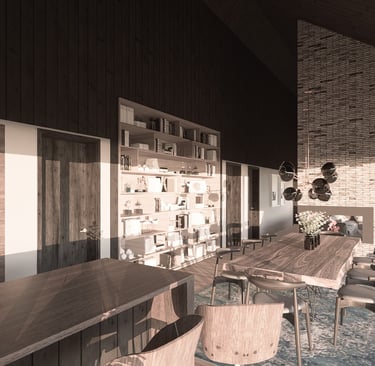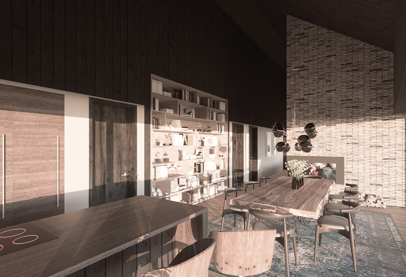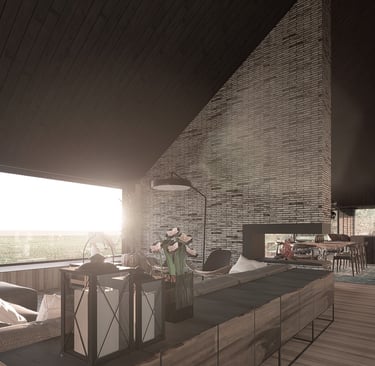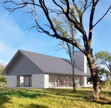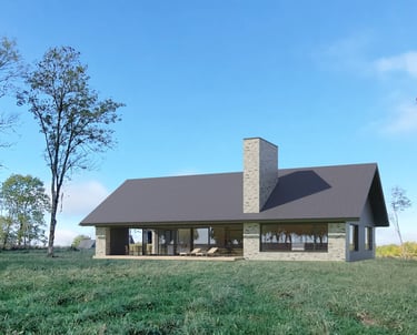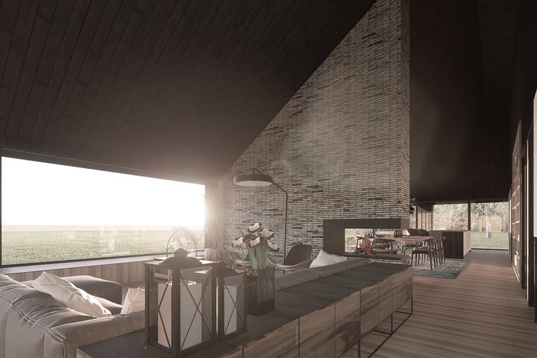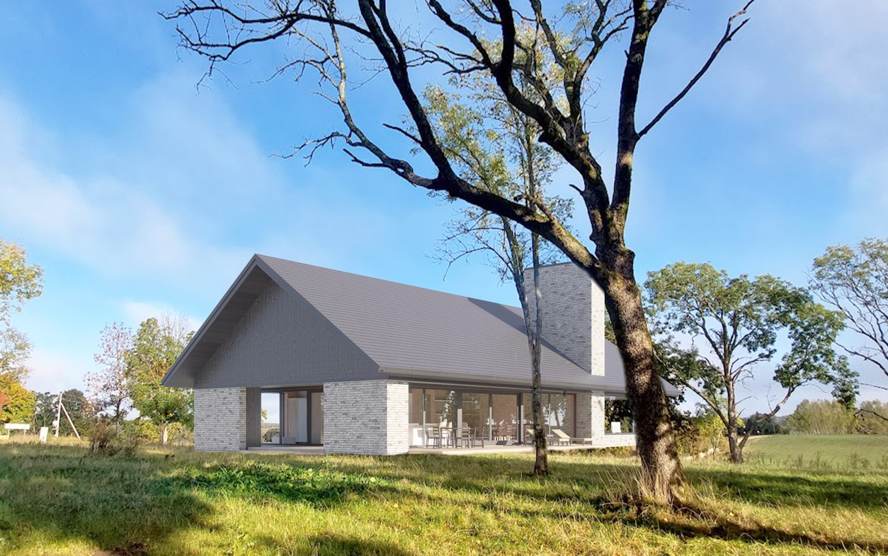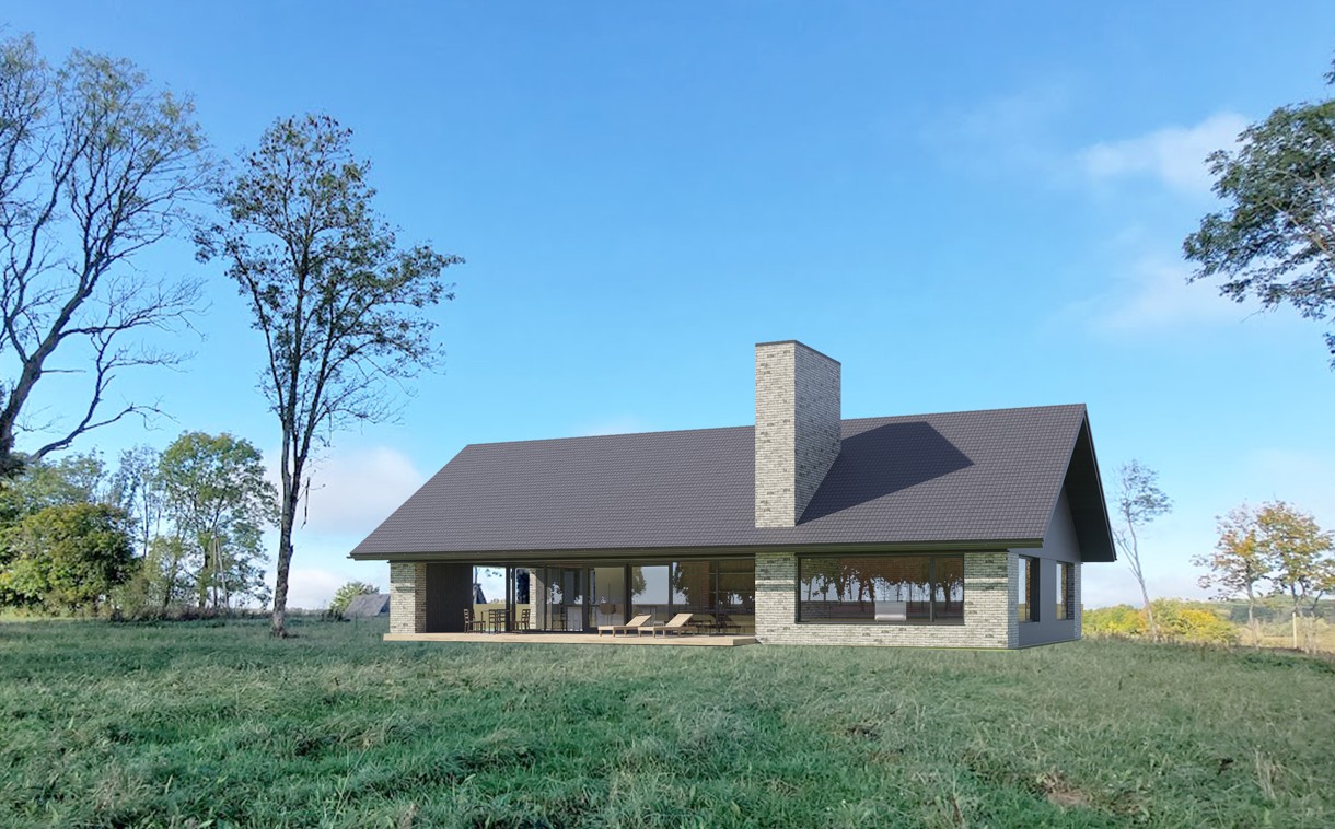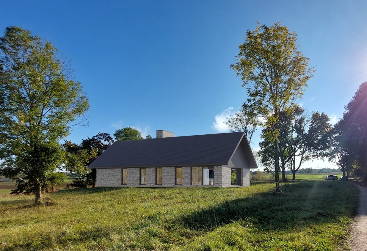 Tai modernios interpretacijos dvišlaitis tūris, pasižymintis racionalia horizontalia kompozicija. Masyvus mūrinis kaminas sukuria skulptūrišką vertikalų akcentą, o įgilinta stiklo vitrinų plokštuma ištrina ribą tarp vidaus ir gamtos. Minimalistinė medžiagų paletė (plytų mūras, degintos lentos) organiškai įsilieja į atvirą peizažą, pabrėždama lakonišką ir tvarią estetiką.