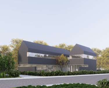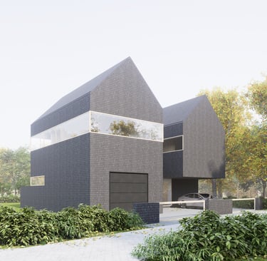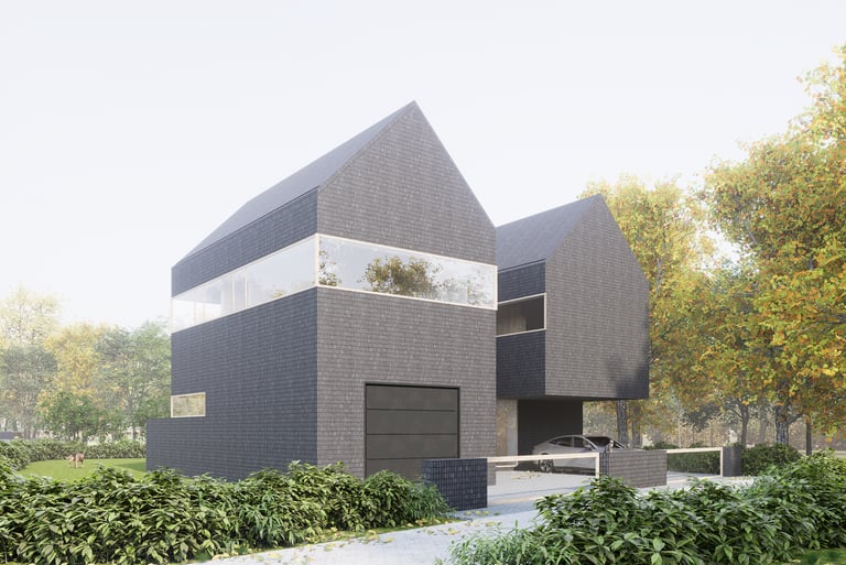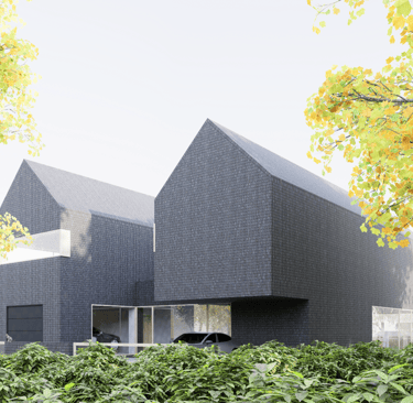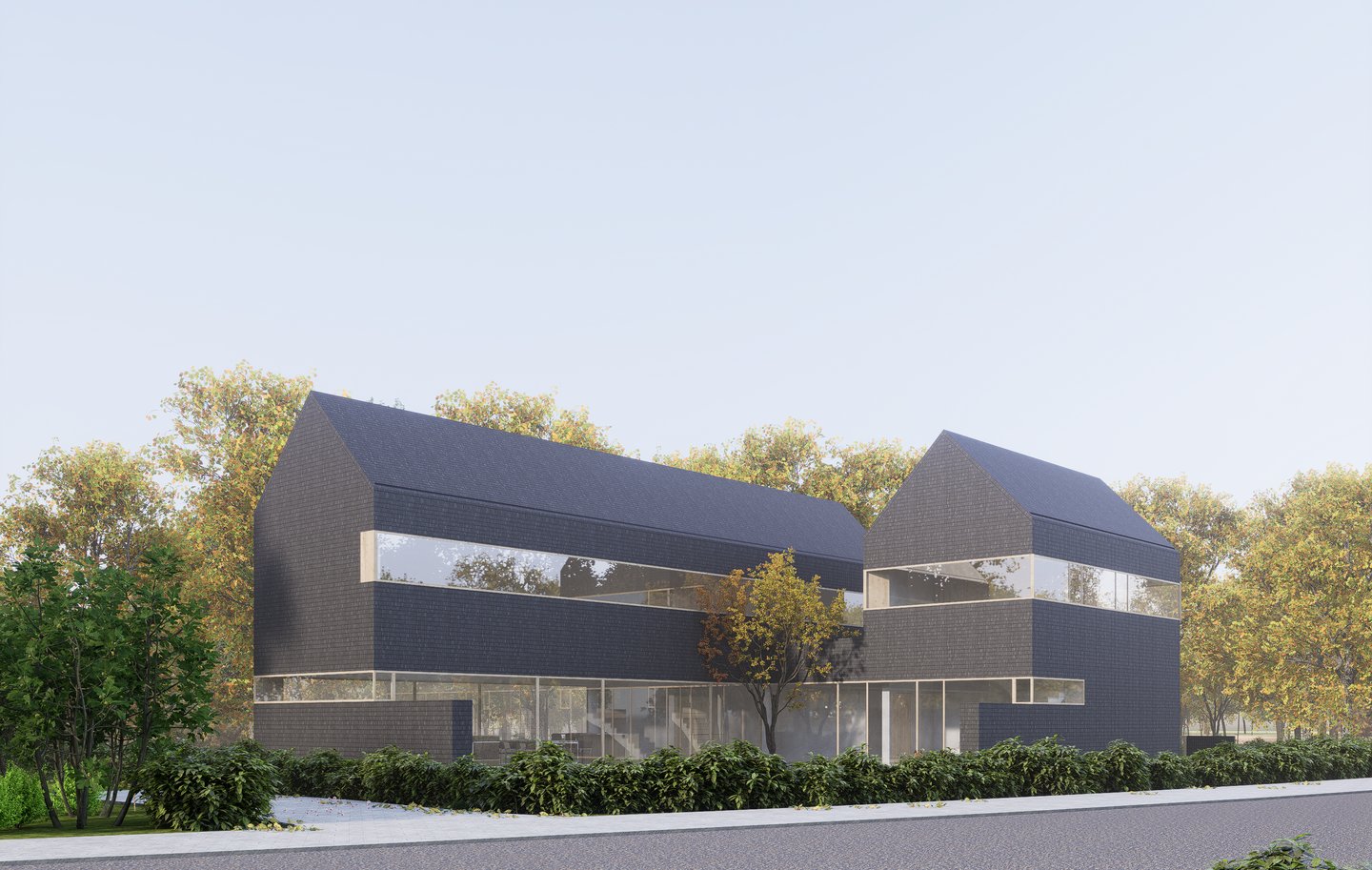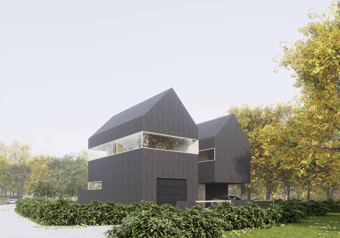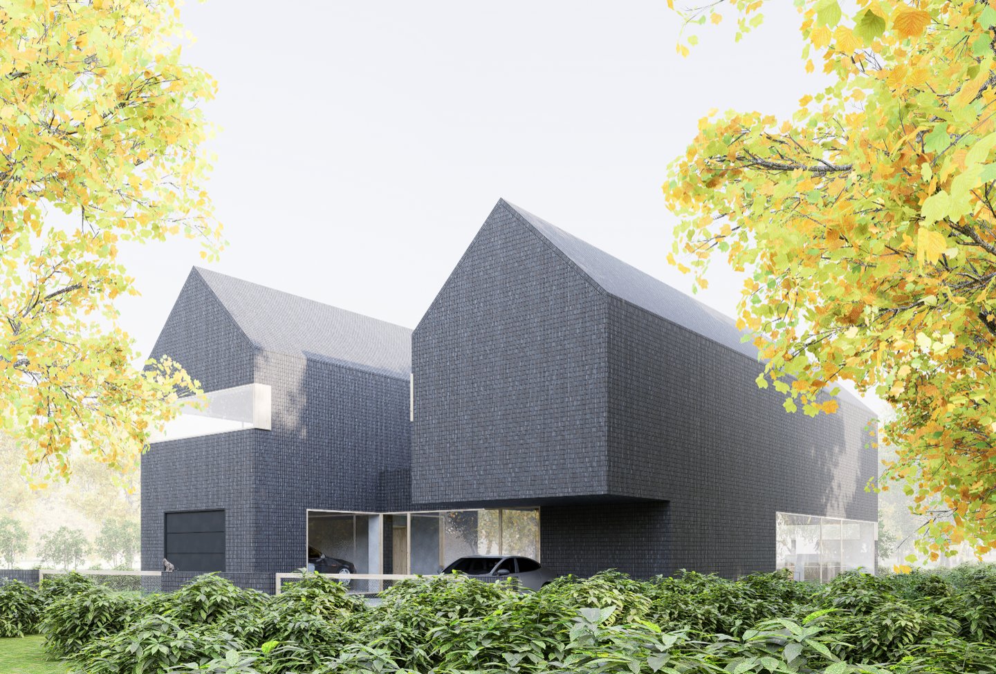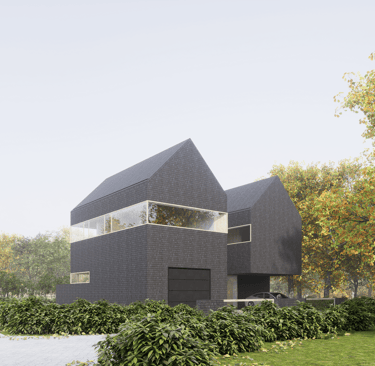 Tai modernus, minimalistinis dviejų tūrių namas. Monotoniškas tamsių plytų fasadas ir dvišlaičiai stogai be karnizų sukuria griežtą siluetą, kurį sušvelnina stiklo skaidrumas bei glaudus ryšys su supančia gamta. Horizontalios langų juostos suteikia pastatui dinamiškumo, o tamsi tekstūra išryškina augmenijos spalvas. Architektūrinis sprendimas levituoti masyvų viršutinį tūrį virš stiklinių vitrinų pabrėžia konstrukcinę drąsą ir vizualinį lengvumą.