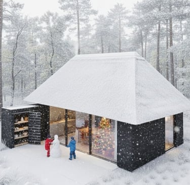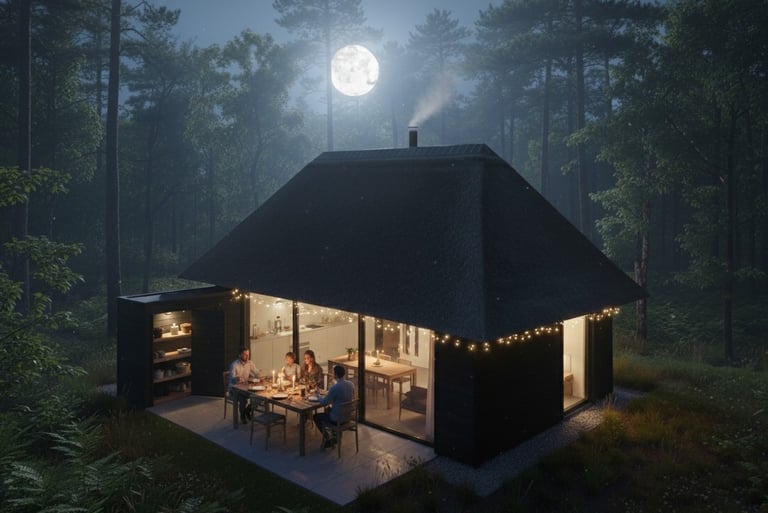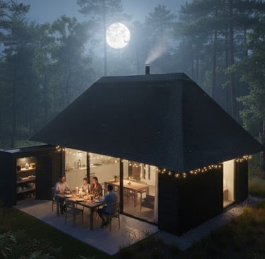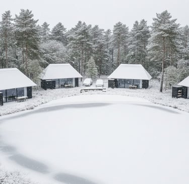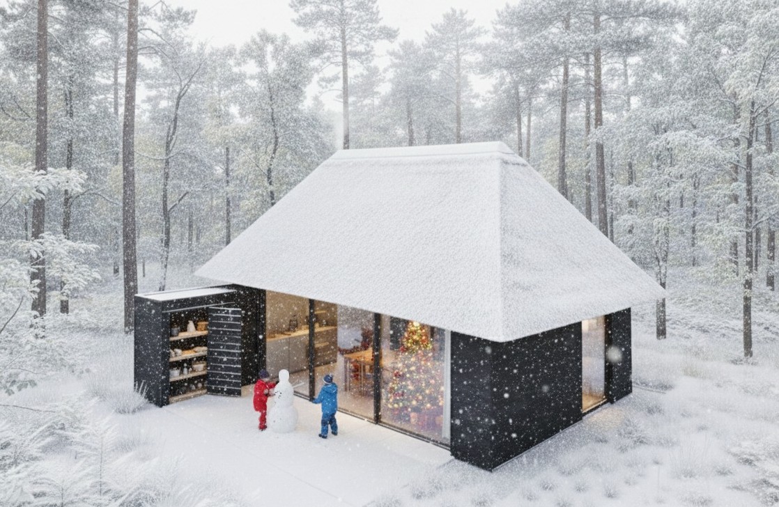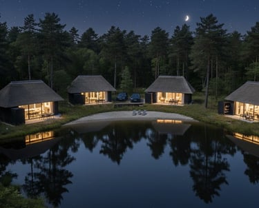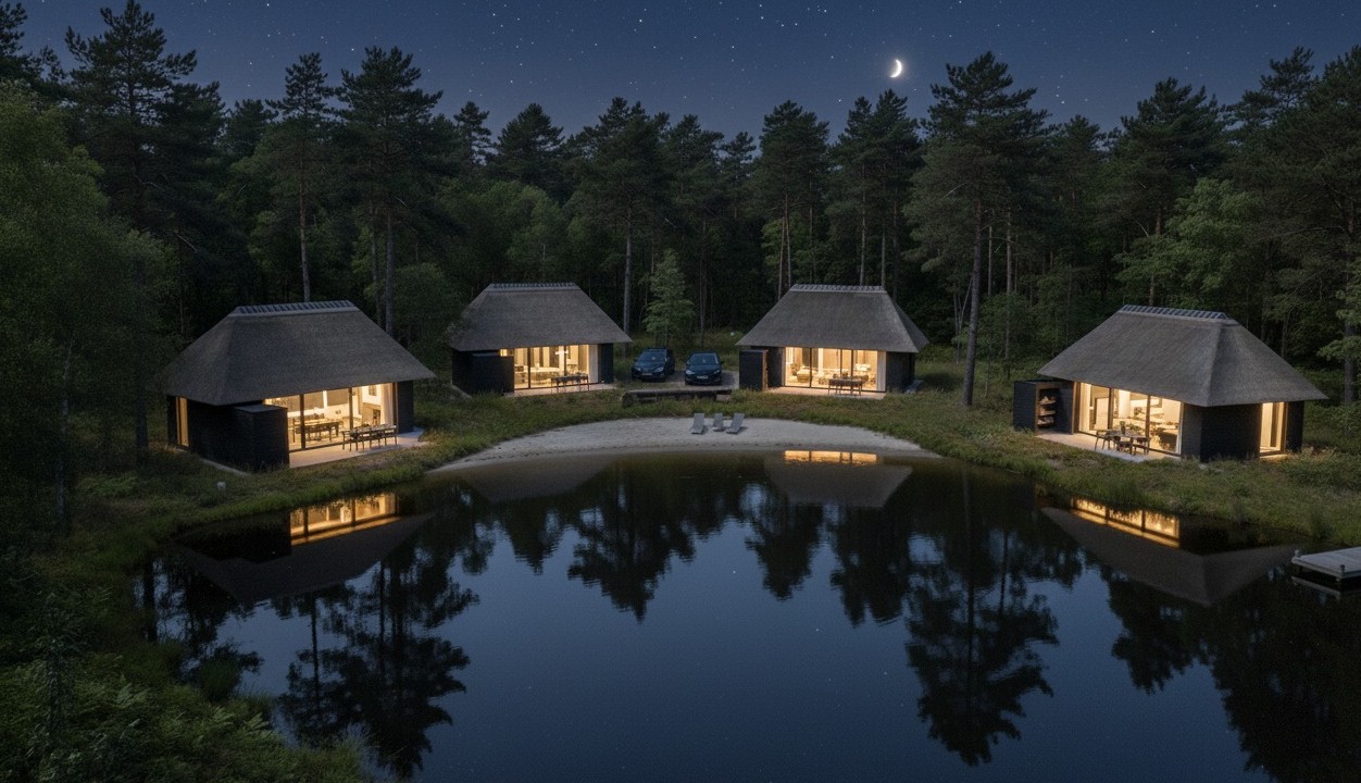 Šiame rekreaciniame ansamblyje dominuoja archetipiniai tūriai su nendriniais keturšlaičiais stogais, sukuriančiais stiprų tekstūrinį ryšį su landšaftu. Tamsaus medžio vertikalus apkalas ir panoraminis įstiklinimas dematerializuoja ribą tarp interjero ir miško aplinkos. Kompozicinė schema orientuota į vandens telkinį, pabrėžiant tūrių ritmiką ir veidrodinį atspindį peizaže.