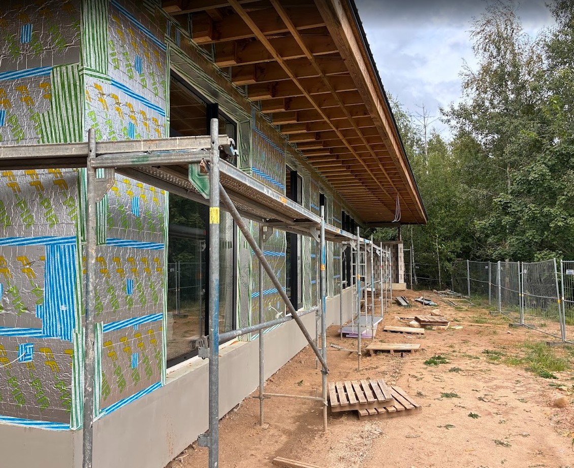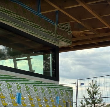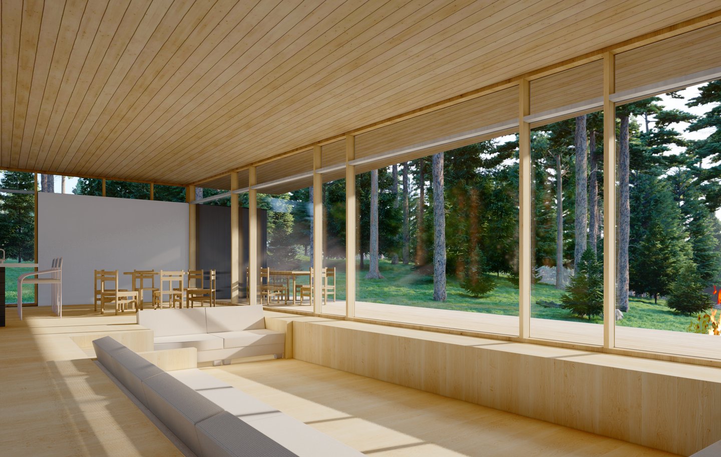 Tai minimalistinis, horizontalios kompozicijos tūris, kurio estetiką formuoja stiklo plokštumo ir natūralaus medžio faktūrų dermė. Architektūrinė kalba grįsta tektoniniu aiškumu: masyvi stogo plokštuma ir vertikalūs medžio elementai kuria ritmišką fasado dinamiką. Panoraminis įstiklinimas ir atvira ugnies zona integruoja interjerą į landšaftą, pabrėždami kontekstualią ramybę.